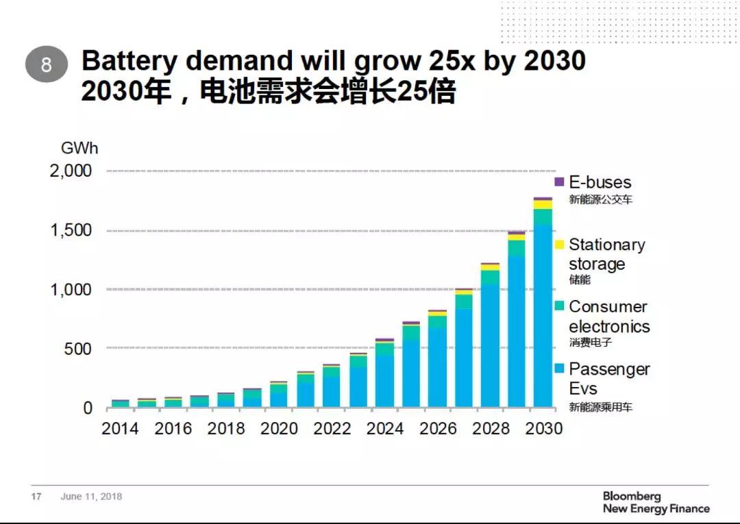 2030年電池需求會增長25倍,需求結(jié)構(gòu)也將發(fā)生改變?!敖衲昶噷︿囯x子電池的需求就會超過消費電子,車用動力電池才是鋰電池最大需求市場?!?/span>McKerracher說,到2030年,新能源乘用車的電池需求將超過1500GWh。