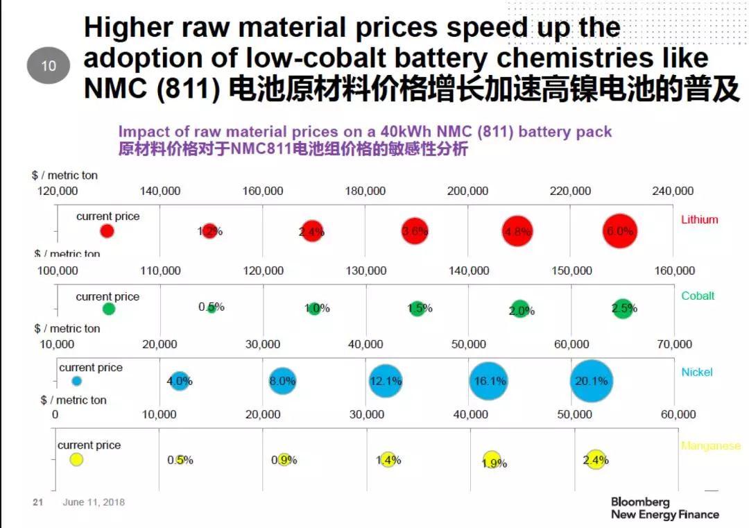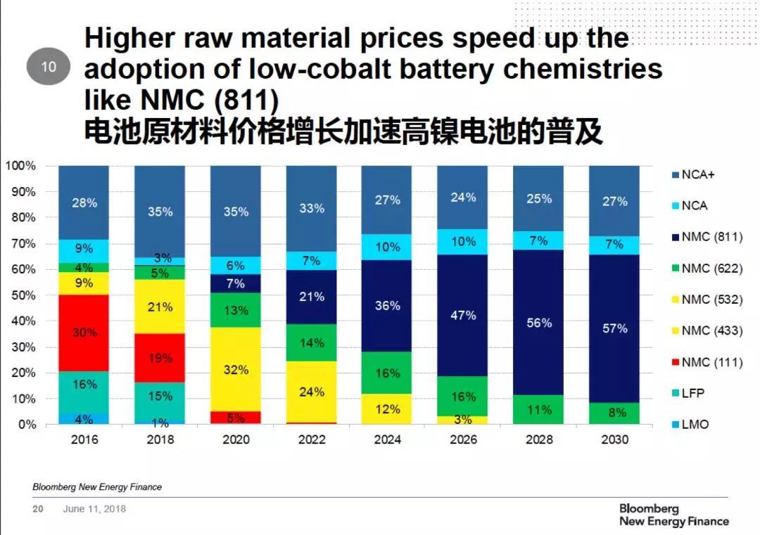 電池類型格局也將發(fā)生改變。電池原材料價格上漲,特別是鈷價上漲,將加速高鎳電池的普。NCM(811)、NCA 、NCA+這三類高鎳電池,今年占比不到40%,2020年就會達到48%,2024年則到73%。