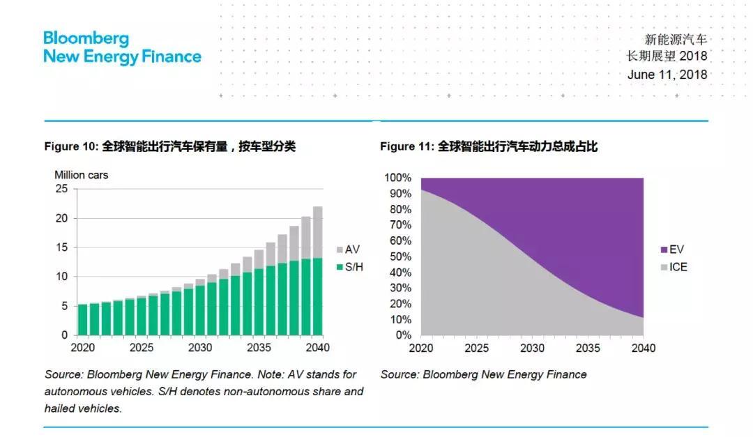 共享出行也會影響新能源汽車的未來銷量。全球共享出行用車將從現(xiàn)在的500萬輛增加至2040年的2000萬輛。到那時,90%的共享出行汽車將是新能源汽車,因其運營成本更低。40%的共享出行汽車將具備高度自動駕駛功能。