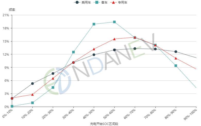 分類別看,不同類別新能源車輛充電開始SOC差異化分布。新能源乘用車充電開始SOC相對分散,其分布位于30%-90%范圍;新能源客車充電開始SOC集中在50%-60%區(qū)間內(nèi);新能源專用車充電開始SOC集中在60%-70%(如圖1所示)。數(shù)據(jù)表明,運營車輛充電相對規(guī)律和集中,而乘用車由于應(yīng)用領(lǐng)域廣,個性化差異大,充電分布較為均勻。