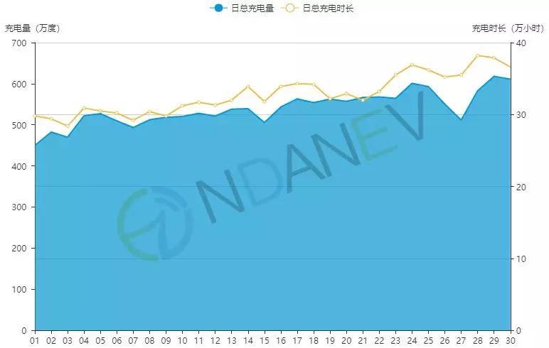 從日總充電量和充電時長來看,4月份新能源汽車日總充電量在400-600萬度之間,日總充電時長在30-40萬小時(如圖2所示),充電量和充電時長較3月份均有大幅度提高。同時,結(jié)合充電量和充電時長曲線,可以看出總充電量變化與充電時長變化曲線較為一致,具有正相關(guān)性,這表明慢充是當(dāng)下新能源汽車充電的主要形式,偶爾才會出現(xiàn)快充集中現(xiàn)象。
