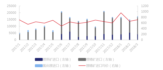 冶煉環(huán)節(jié),據(jù)SMM調(diào)研數(shù)據(jù),2018年一季度中國鋰鹽產(chǎn)量3.26萬噸碳酸鋰當量(2.4萬噸碳酸鋰和0.95萬噸氫氧化鋰)。冶煉端消耗量減去鋰原料進口4.85萬噸碳酸鋰當量,2018年一季度中國原生鋰原料環(huán)節(jié)庫存增量約為1.6萬噸碳酸鋰當量。