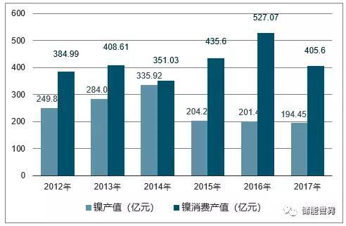 2017年中國鎳產(chǎn)值為194.45億元,同比下降3.45%;2016年中國鎳產(chǎn)值為201.4億元。2017年中國鎳消費(fèi)產(chǎn)值為405.6億元,同比下降23.05%;2016年中國鎳消費(fèi)產(chǎn)值為527.07億元。