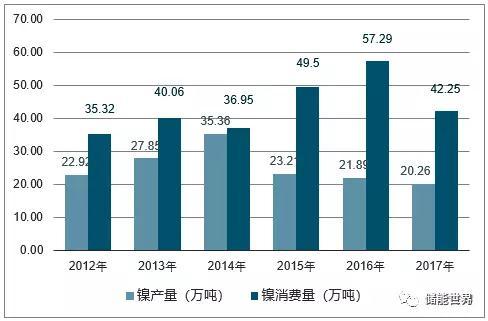 2017年中國鎳產(chǎn)量為20.26萬噸,同比下降7.47%;2016年中國鎳產(chǎn)量為21.89萬噸。2017年中國鎳消費(fèi)量為42.25萬噸,同比下降26.25%;2016年中國鎳消費(fèi)量為57.29萬噸。