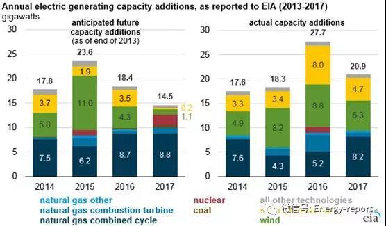 核電裝機(jī)增量也面臨推遲并網(wǎng):在2013年年末,田納西州的沃茨巴(WattsBar)核電站2號(hào)機(jī)組預(yù)計(jì)在2015年并網(wǎng),而另外兩個(gè)核電站預(yù)計(jì)在2017年并網(wǎng)。但實(shí)際上,沃茨巴(WattsBar)核電站2號(hào)機(jī)組2016年6月才完成并網(wǎng),其他的兩個(gè)項(xiàng)目(佐治亞州的沃格特勒<Vogtle>核電站3號(hào)、4號(hào)機(jī)組和南加州的桑默核電站<VirgilC.Summer>2號(hào)和3號(hào)機(jī)組)并網(wǎng)無限期推遲。