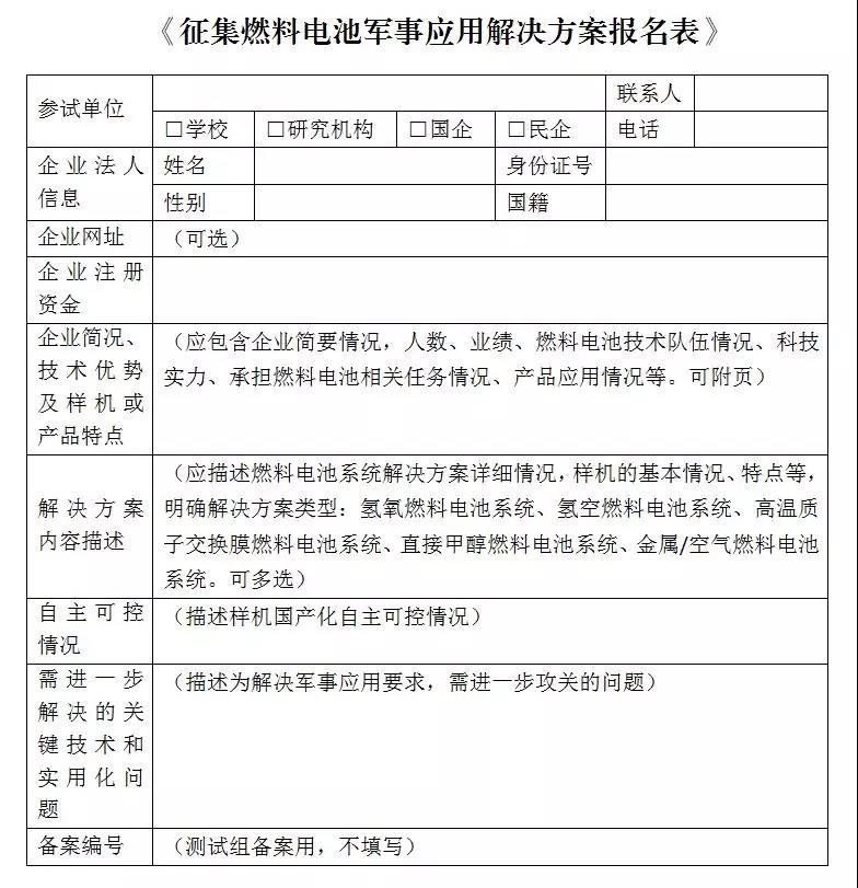 填寫(xiě)《征集燃料電池軍事應(yīng)用解決方案報(bào)名表》(附后),發(fā)送電子郵件至songshuang_1021@126.com。報(bào)名聯(lián)系人及電話(huà):宋爽,17720519646。