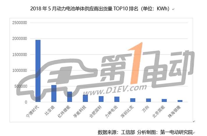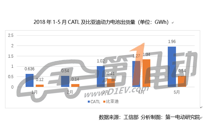 2018年1-5月,CATL與比亞迪累計(jì)動(dòng)力電池出貨量分別為5.43GWh和2.55GWh,CATL依舊領(lǐng)跑動(dòng)力電池市場(chǎng),而且正在拉大和比亞迪之間的距離,比亞迪電池5月出貨量出現(xiàn)明顯下滑,顯得極不尋常。