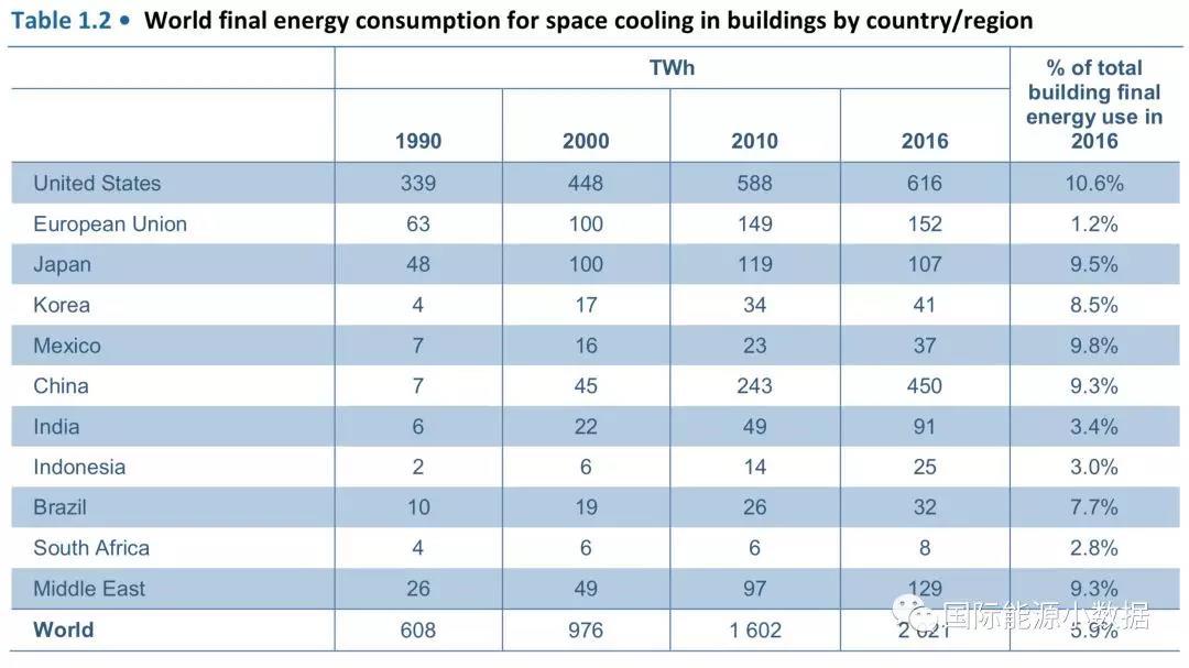 從能耗低角度看,2016年全球建筑制冷耗電1602 TWh(16020億千瓦時),其中美國(616TWh)、中國(450TWh)、歐盟(152TWh)、日本(107TWh)。