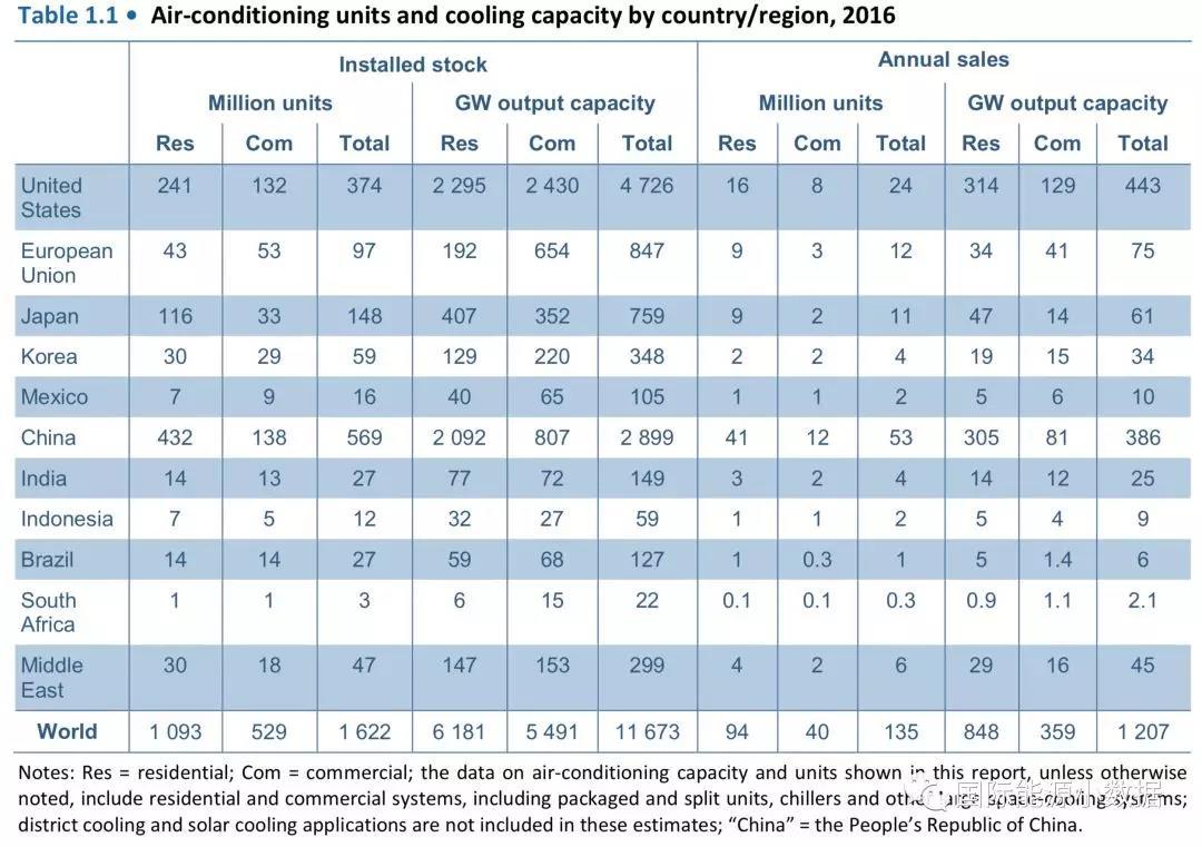 到2016年底全球正在運行的空調(diào)機有16.22億臺(11673吉瓦),其中家用空調(diào)10.93億臺(6181吉瓦),商戶空調(diào)5.29億臺(5491吉瓦)。在全球范圍內(nèi)中國擁有空調(diào)機數(shù)量最多,到2016年底共有5.69億臺(2899吉瓦),占全球總數(shù)的35%;其中家用空調(diào)4.32億臺(2092吉瓦),商戶空調(diào)1.38億臺(807吉瓦)。美國空調(diào)數(shù)量全球排在第二位,共有3.74億臺(4726吉瓦),占全球總數(shù)的23%;其中家用空調(diào)2.41億臺(2295吉瓦),商戶空調(diào)1.32億臺(2430吉瓦)。值得注意的是,美國空調(diào)機數(shù)量雖然比中國少,但是制冷容量卻超出中國一倍,說明美國家庭和商戶的面積比較大,所使用的空調(diào)機制冷能力也比較大。