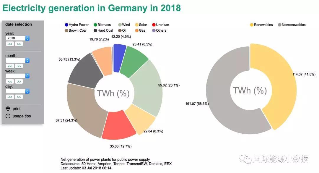 中國儲(chǔ)能網(wǎng)訊:根據(jù)德國ISE研究所的最新數(shù)據(jù),2018年上半年德國發(fā)電總量為113TWh(1130億千瓦時(shí)),可再生能源發(fā)電再創(chuàng)新高,比例達(dá)到41.5%(風(fēng)電20.2%、生物質(zhì)8.5%、太陽能8.3%、水電4.5%),化石能源發(fā)電占比44.8%。以單一電源來看,煤電依然是老大,占發(fā)電量比例為37.6%(褐煤24.3%、硬煤13.3%),其他電源包括核電(12.7%)、天然氣(7.2%)、其他(1%)。