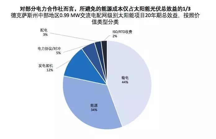 如果被太陽能替代的電力越來越便宜,太陽能的價(jià)值怎么會(huì)提高呢?其關(guān)鍵原因在于配網(wǎng)級(jí)別太陽能不僅避免了電力批發(fā)成本,還節(jié)約了其他相關(guān)的非能源成本,如配電網(wǎng)絡(luò)、發(fā)電裝機(jī)等基礎(chǔ)設(shè)施建造成本,尤其是輸電部分。