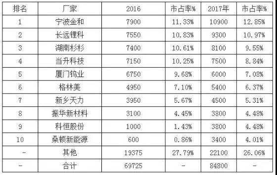 NCM產(chǎn)量從69725噸增至84800噸,同比增加22%。產(chǎn)能則從69375噸增至145200噸,增幅超100%。寧波金和為龍頭,市占率約13%。長(zhǎng)遠(yuǎn)鋰科、湖南杉杉、當(dāng)升科技緊隨其后。市占率5%以上的廠家多達(dá)7家,市場(chǎng)集中度較低。