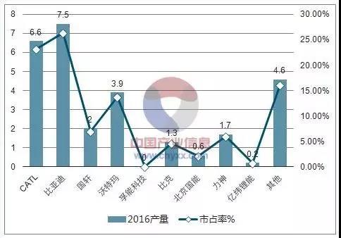 2016年國(guó)內(nèi)主要?jiǎng)恿﹄姵貜S家產(chǎn)量及市占率(GWh)