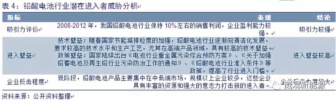 替代品的威脅:目前市場(chǎng)上主要充電電池有鎳氫電池、鉛蓄電池和鋰離子電池,其中鋰離子電池對(duì)鉛酸電池具有很強(qiáng)的競(jìng)爭(zhēng)性。在鋰電池和鉛酸蓄電池的屬性對(duì)比中,兩種不同類型的電池各具優(yōu)勢(shì)。鉛酸蓄電池最大的優(yōu)勢(shì)就是適用溫度帶很寬。在低溫環(huán)境中放電功能良好,在高溫環(huán)境中本體不會(huì)發(fā)生爆炸,安全性能高。它的另一個(gè)較大的優(yōu)勢(shì)則是售價(jià)低廉,這得益于它豐富的原料以及高資源循環(huán)率。反觀鋰電池,它的優(yōu)勢(shì)在于電池能量密度高,這可以讓它需要高續(xù)航能力的新能源汽車領(lǐng)域打開市場(chǎng)。此外,國(guó)家出臺(tái)的相關(guān)政策也支持鋰離子電池的發(fā)展。