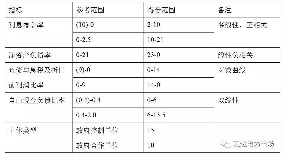 國際上電力市場的信用評價大都采用該種思路。以PJM為例,市場主體可以由評級機構給出的信用評級得到信用評分,或由PJM根據其財務狀況、經營情況、交易行為等進行信用評分。在當前的PJM信用評分體系中,涉及的評價指標包括:利息覆蓋率,考察市場主體利潤與成本的關系;凈資產負債率和負債與利潤的比率,考慮市場主體資本結構,一般來說市場主體的負債太多會導致風險過大,太少則盈利能力較差,適當的資本結構才是合理的;自由現金與負債比率,考察市場主體的短期債務償還能力。此外,還考察電力市場的市場主體是否與政府相關,并根據密切程度給予不同的加分。這幾項之中,利息覆蓋率及凈資產負債率的評分的比重較大,負債與利潤比率、自由現金與負債比率以及主體類型的比重較小。然后將各項得分加起來得到市場主體的信用評分,見下表。