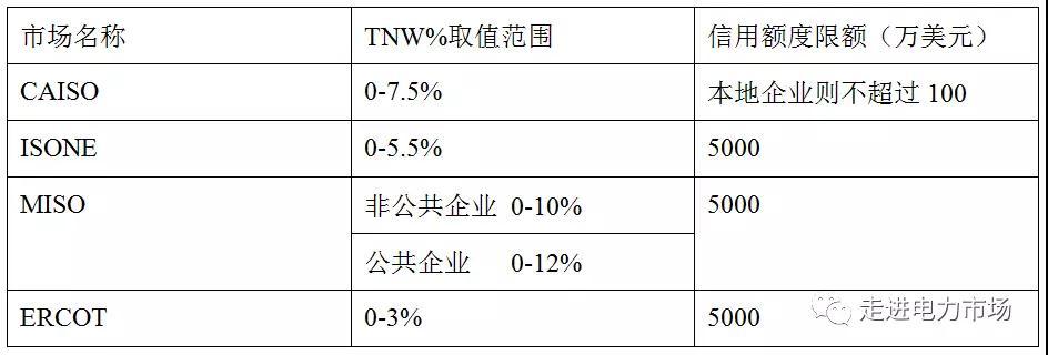 表2 北美電力市場的市場主體無抵押信用額度限額