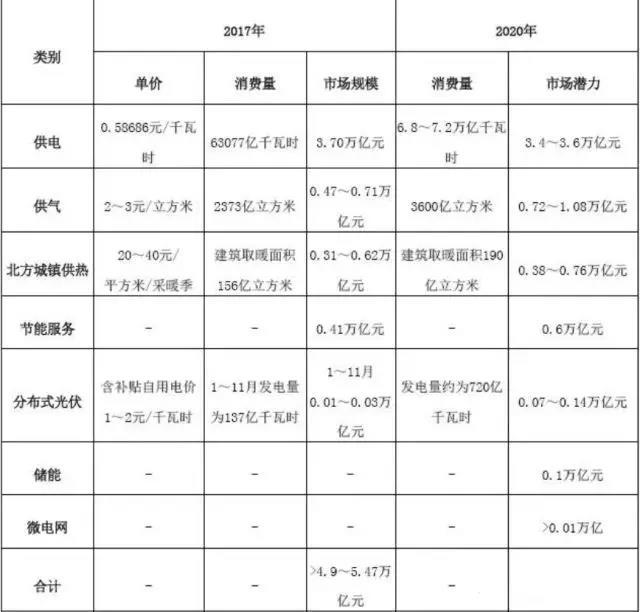 從市場(chǎng)需求看,若僅選取供電、供氣、北方城鎮(zhèn)供熱、分布式光伏、節(jié)能服務(wù)、微電網(wǎng)、儲(chǔ)能七個(gè)主要的業(yè)務(wù)領(lǐng)域進(jìn)行分析測(cè)算,2017年市場(chǎng)規(guī)模超4.9~5.47萬億元,到2020年市場(chǎng)潛力至少為5.28~6.29萬億元,具體估算如表2所示。