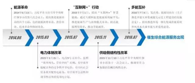 2014年6月13日,中央財(cái)經(jīng)領(lǐng)導(dǎo)小組第6次會(huì)議明確提出了我國能源安全發(fā)展的“四個(gè)革命”戰(zhàn)略思想,即:推動(dòng)能源消費(fèi)革命,抑制不合理能源消費(fèi);推動(dòng)能源供給革命,建立多元供應(yīng)體系;推動(dòng)能源技術(shù)革命,帶動(dòng)產(chǎn)業(yè)升級(jí);推動(dòng)能源體制革命,打通能源發(fā)展快車道。隨后電力體制改革9號(hào)文出臺(tái),按照“管住中間,放開兩頭”的原則,提出“三放開、一獨(dú)立”政策,而供給側(cè)結(jié)構(gòu)性改革著力在去產(chǎn)能方面發(fā)力,特別是煤炭去產(chǎn)能成為能源領(lǐng)域的重要內(nèi)容,并以“互聯(lián)網(wǎng)+”智慧能源這一新概念促進(jìn)能源系統(tǒng)扁平化,加上多能互補(bǔ)的發(fā)展方向,這一系列政策的出臺(tái)(具體見圖1)有效地推動(dòng)了能源供應(yīng)結(jié)構(gòu)向多元化發(fā)展,從而促進(jìn)新業(yè)態(tài)的發(fā)展,催生新的商業(yè)模式,即綜合能源服務(wù)的誕生。