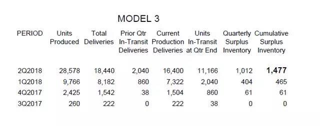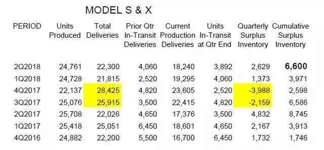 這個(gè)表格的原理是這樣的:特斯拉在每個(gè)季度結(jié)束后的幾天內(nèi)會(huì)報(bào)告三個(gè)關(guān)鍵數(shù)字:生產(chǎn)、交付以及在途中、預(yù)計(jì)下一季度交付的汽車數(shù)量。對(duì)ModelS和ModelX而言,今年第二季度這三個(gè)數(shù)字分別是24761、 22300和 3892臺(tái),但我們需要從第二季度交付的數(shù)量中減去在第一季度已生產(chǎn)好的數(shù)量,來得出第二季度實(shí)際生產(chǎn)并交付的數(shù)量。