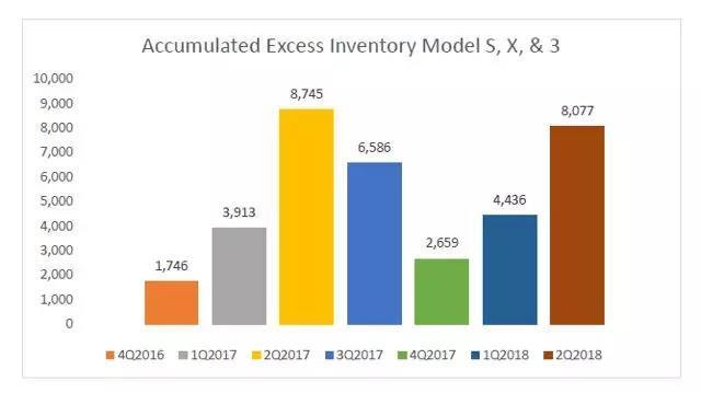 從2016年第3季度末到2017年第2季度末,僅僅三個(gè)季度,特斯拉的庫(kù)存從14臺(tái)增至8822臺(tái),未售出庫(kù)存的價(jià)值超過10億美元。