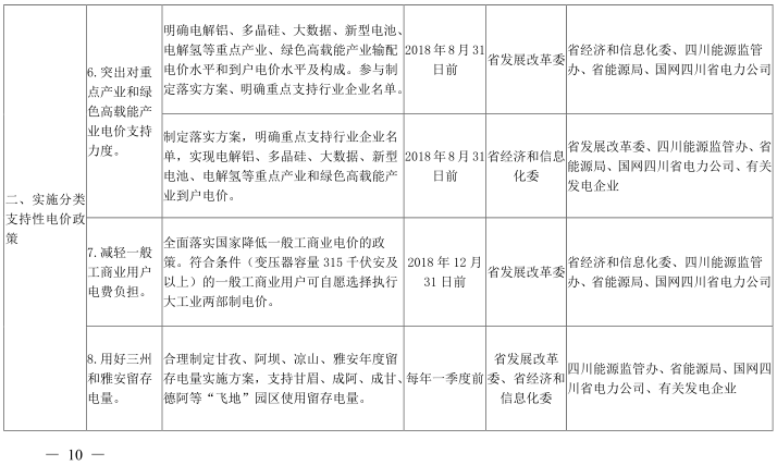 6.突出對(duì)重點(diǎn)產(chǎn)業(yè)和綠色高載能產(chǎn)業(yè)電價(jià)支持力度。對(duì)電解鋁、多晶硅保持現(xiàn)有輸配電價(jià)水平,到戶電價(jià)分別實(shí)現(xiàn)每千瓦時(shí)0.30元左右、0.40元左右水平;對(duì)大數(shù)據(jù)、新型電池、電解氫等綠色高載能產(chǎn)業(yè),輸配電價(jià)比照藏區(qū)留存電量輸配電價(jià)每千瓦時(shí)0.105元收取,到戶電價(jià)分別實(shí)現(xiàn)每千瓦時(shí)0.35元、0.35元、0.30元左右水平。