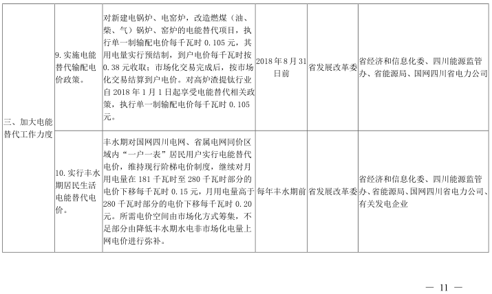 9.實(shí)施電能替代輸配電價(jià)政策。對(duì)新建電鍋爐、電窯爐,改造燃煤(油、柴、氣)鍋爐、窯爐的電能替代項(xiàng)目,執(zhí)行單一制輸配電價(jià)每千瓦時(shí)0.105元,其用電量實(shí)行預(yù)結(jié)制,到戶電價(jià)每千瓦時(shí)按0.38元收取;市場化交易完成后,按市場化交易結(jié)算到戶電價(jià)。對(duì)高爐渣提鈦行業(yè)自2018年1月1日起享受電能替代相關(guān)政策,執(zhí)行單一制輸配電價(jià)每千瓦時(shí)0.105元。