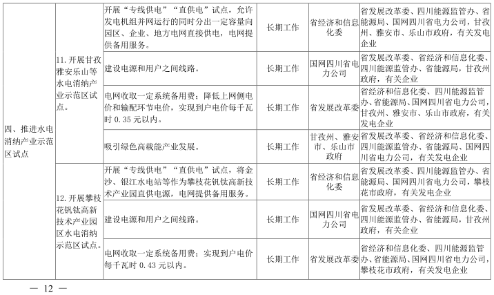 12.開展攀枝花釩鈦高新技術(shù)產(chǎn)業(yè)園區(qū)水電消納示范區(qū)試點(diǎn)。利用攀西斷面棄水電量降低攀枝花釩鈦產(chǎn)業(yè)電價(jià),以“專線供電”方式將金沙、銀江水電站等作為攀枝花釩鈦高新技術(shù)產(chǎn)業(yè)園區(qū)直供電源,實(shí)現(xiàn)到戶電價(jià)每千瓦時(shí)0.43元以內(nèi)。