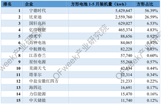 2018年1-5月份中國方形動(dòng)力電池裝機(jī)量排名