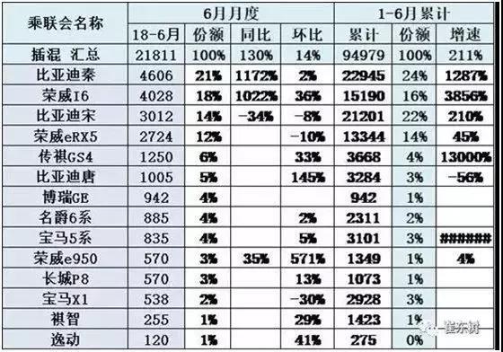 而從銷(xiāo)量來(lái)看,根據(jù)乘聯(lián)會(huì)數(shù)據(jù),比亞迪秦、榮威I6、比亞迪宋、榮威eRX5等幾款車(chē)型上半年的累計(jì)銷(xiāo)量均突破1萬(wàn)輛。具體排行如下: