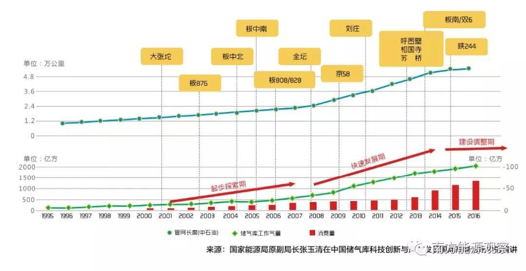 中國(guó)的儲(chǔ)氣調(diào)峰能力建設(shè)啟動(dòng)于1999年,隨著西氣東輸?shù)忍烊粴忾L(zhǎng)輸管道建設(shè)及天然氣工業(yè)發(fā)展而發(fā)展,歷經(jīng)起步探索期和快速發(fā)展初期兩個(gè)階段。中國(guó)首次大規(guī)模采用儲(chǔ)氣庫(kù)調(diào)峰,始于陜京輸氣管道工程。為了解決北京市季節(jié)用氣不均衡的問題,保證向北京市穩(wěn)定供氣,1999年,中石油修建了大港油田大張坨地下儲(chǔ)氣庫(kù)。大港儲(chǔ)氣庫(kù)除了向北京供氣以外,還有部分天然氣供應(yīng)天津、河北滄州等地。為保證供氣安全,2001年來,繼大張坨地下儲(chǔ)氣庫(kù)后,中石油又陸續(xù)建成了板876地下儲(chǔ)氣庫(kù)和板中北高點(diǎn)地下儲(chǔ)氣庫(kù)。