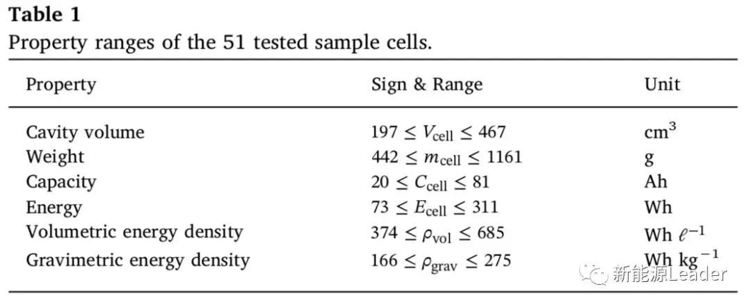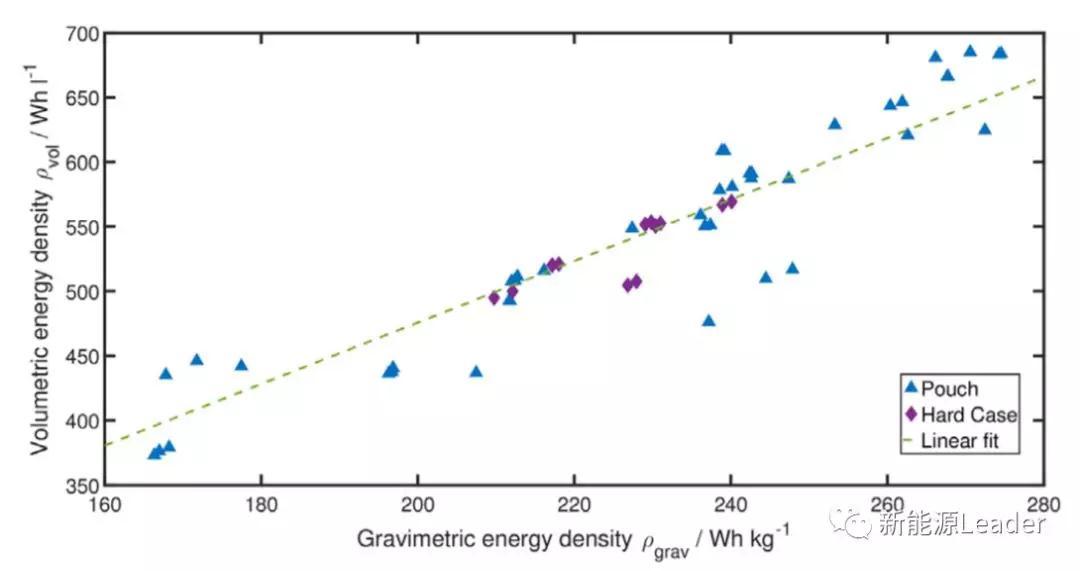 為了獲取不同類(lèi)型電池的測(cè)試數(shù)據(jù),Sascha Koch共計(jì)對(duì)51只動(dòng)力電池進(jìn)行了測(cè)試,其中41只為軟包電池,10只為硬殼電池,所有電池均為NCM/石墨體系,電解液鋰鹽為L(zhǎng)iPF6,以及多種類(lèi)型的溶劑,包括EC、DMC、DEC和EMC等,51種電池的基本信息如下表所示。51種電池中包括“功率型”電池和“能量型”電池,下圖展示了電池的體積能量密度與重量能量密度之間的關(guān)系,其中綠色線(xiàn)段為擬合結(jié)果,從圖中能夠看到51款動(dòng)力電池體積能量密度平均是重量能量密度的2.38倍。