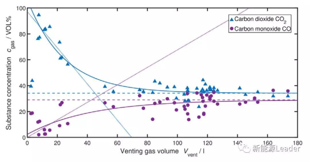 Sascha Koch的研究表明在熱失控中鋰離子電池產(chǎn)生的氣體主要有O2、CO、H2、C2H4、CH4、C2H6和C3H6七種氣體,占比達(dá)到99%以上,不同氣體的濃度與電池的容量無(wú)關(guān),但是產(chǎn)生氣體的總量與電池的容量密切相關(guān),平均每Ah容量會(huì)產(chǎn)生1.96L氣體,電池的熱穩(wěn)定性與電池的能量密度密切相關(guān),電池的體積能量密度每提升1Wh/L,電池的熱失控觸發(fā)溫度就要下降0.42℃。