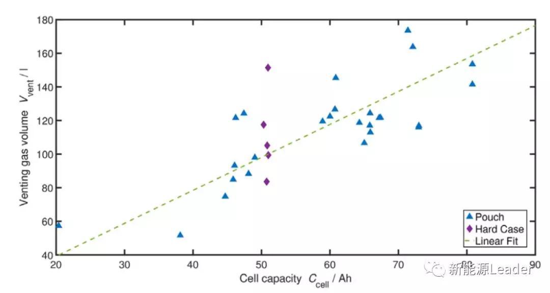從前面的研究發(fā)現(xiàn),鋰離子電池在熱失控中產(chǎn)生的不同種類(lèi)氣體的濃度與產(chǎn)生的氣體數(shù)量之間沒(méi)有直接的關(guān)系,但是熱失控中產(chǎn)生氣體的體積卻與鋰離子電池的容量存在密切的關(guān)系(如下圖所示),通過(guò)對(duì)數(shù)據(jù)進(jìn)行擬合,發(fā)現(xiàn)熱失控中鋰離子電池產(chǎn)生氣體的數(shù)量與電池容量之間存在線(xiàn)性關(guān)系,平均每個(gè)Ah的容量可以產(chǎn)生1.96L的氣體。