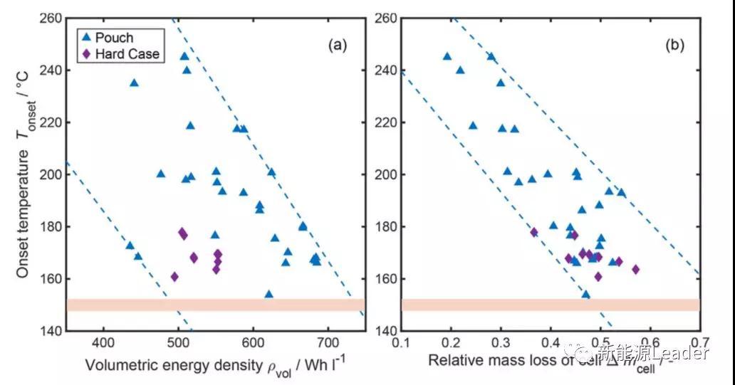 影響鋰離子電池?zé)崾Э剡^(guò)程的不僅僅是容量,能量密度對(duì)鋰離子電池的熱失控也有顯著的影響,例如從下圖a中我們能夠看到隨著鋰離子電池體積能量密度的不斷上升,鋰離子電池的熱失控觸發(fā)溫度也在持續(xù)的降低,從擬合結(jié)果來(lái)看,電池的體積能量密度每提高1Wh/L,電池的熱失控觸發(fā)溫度就要下降0.42℃。從下圖b能夠看到,鋰離子電池?zé)崾Э赜|發(fā)溫度越高,則熱失控中鋰離子電池的質(zhì)量損失越小,反之亦然。從上面的分析可以看到,鋰離子電池能量密度越高,則電池?zé)岱€(wěn)定性越差、熱失控越劇烈。