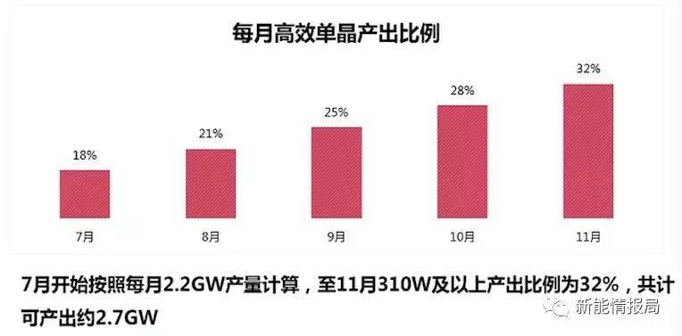 他說:“按照2.2GW單晶電池片產(chǎn)量加上每月8%產(chǎn)出比例計算,7月到11月310W及以上組件產(chǎn)出比例約32%,共計可產(chǎn)出約2.7GW,供應(yīng)可能非常緊張,現(xiàn)在行業(yè)高功率組件產(chǎn)品處于一個緊張的生產(chǎn)狀態(tài)?!?