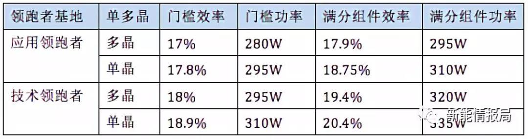 能源局規(guī)定了2017年領(lǐng)跑者基地采用多單晶組件的門檻效率與滿分效率指標(biāo),其中應(yīng)用領(lǐng)跑者基地采用的多晶組件和單晶組件的滿分轉(zhuǎn)換效率分別為17.9%和18.7%,對應(yīng)組件功率應(yīng)達(dá)到295W和310W;技術(shù)領(lǐng)跑基地采用的多晶組件和單晶組件的滿分轉(zhuǎn)換效率分別為19.4%和20.4%,對應(yīng)組件功率為320W和335W(如下表)。