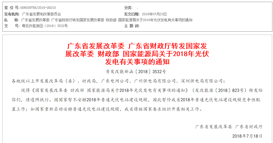 中國儲(chǔ)能網(wǎng)訊:7月23日,廣東省發(fā)展改革委、廣東省財(cái)政廳轉(zhuǎn)發(fā)國家發(fā)展改革委、財(cái)政部、國家能源局關(guān)于2018年光伏發(fā)電有關(guān)事項(xiàng)的通知,因國家暫不安排2018年普通光伏電站建設(shè)規(guī)模,因此暫停我省2018年普通光伏電站建設(shè)規(guī)模競爭性配置工作;如國家重新啟動(dòng)安排普通光伏電站建設(shè)規(guī)模,我省將按國家要求組織開展相關(guān)工作。