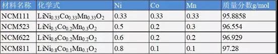 中國儲能網(wǎng)訊:理論三元材料的容量計(jì)算,如下為各三元材料的質(zhì)量分?jǐn)?shù)計(jì)算:
