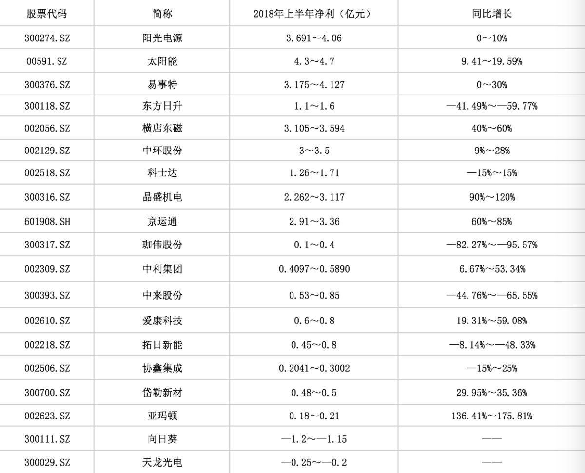 在第一財(cái)經(jīng)梳理的已經(jīng)發(fā)布2018年業(yè)中期預(yù)告的19家光伏行業(yè)上市公司中,有8家企業(yè)預(yù)計(jì)凈利潤(rùn)出現(xiàn)不同程度的下滑,凈利潤(rùn)總額約為26.4億元~32.2億元。