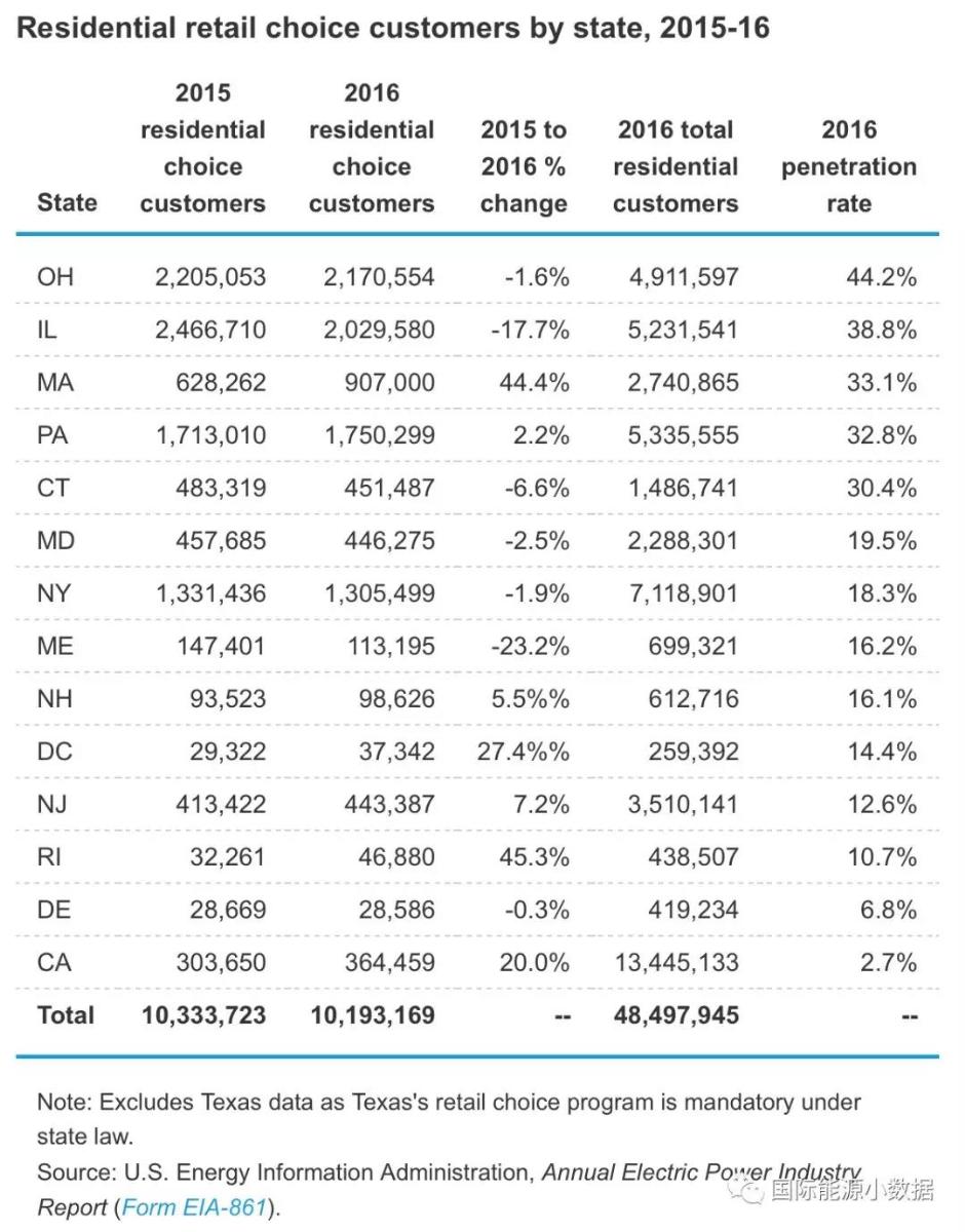 中國儲(chǔ)能網(wǎng)訊:美國電力市場(chǎng)售電側(cè)實(shí)現(xiàn)了競(jìng)爭(zhēng),居民用電戶可以從當(dāng)?shù)氐呐潆姽举I電,也可以自由選擇供電商(只有德克薩斯法定必須參與自由選擇供電商)。到2016年有1019.3戶選擇了售電商,占美國全國用戶總數(shù)的7.8%(2014年這一比例曾達(dá)到8.9%)。