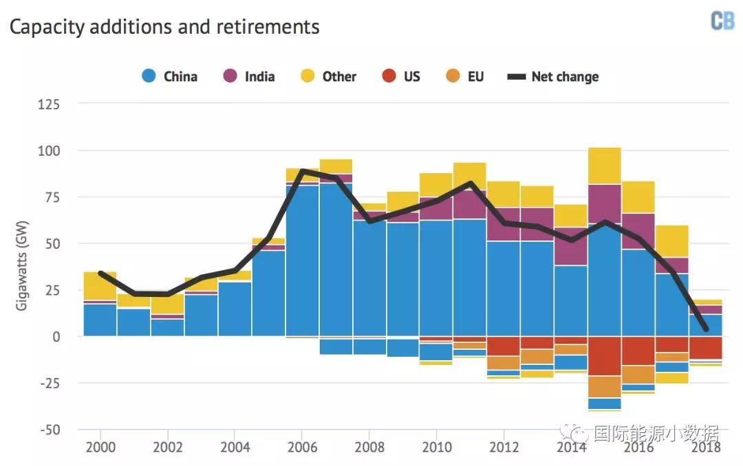 在2018年上半年全球新并網(wǎng)的19.739吉瓦煤電裝機(jī)容量中,有中國(+12.114吉瓦)、印度(+4.860吉瓦)、南非(+0.794吉瓦)、巴基斯坦(0.660吉瓦)、越南(+0.600吉瓦)、菲律賓(+0.420吉瓦)、日本(+0.261吉瓦)。而在全球退役的16.169吉瓦裝機(jī)容量中,有美國(-12.317吉瓦)、中國(-1.511吉瓦)、印度(-1.304吉瓦)、德國(-0.432吉瓦)。