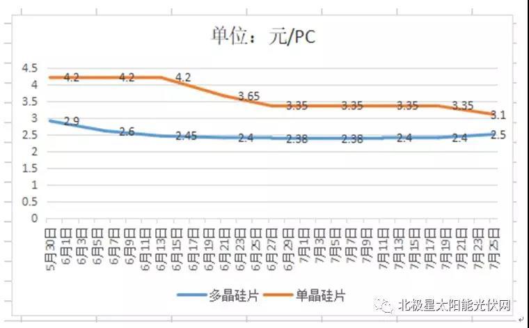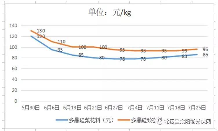 市場驟緊,補(bǔ)貼下調(diào)的另一大影響是光伏產(chǎn)品價格大幅下降,據(jù)統(tǒng)計自5月31日以來8周內(nèi),多晶硅菜花料均價由120元/kg降至80元/kg上下,致密料均價由130元/kg降至90元/kg左右;多晶硅片均價由4.2元/PC降至3.1,單晶硅片由2.9元/PC降至2.4。