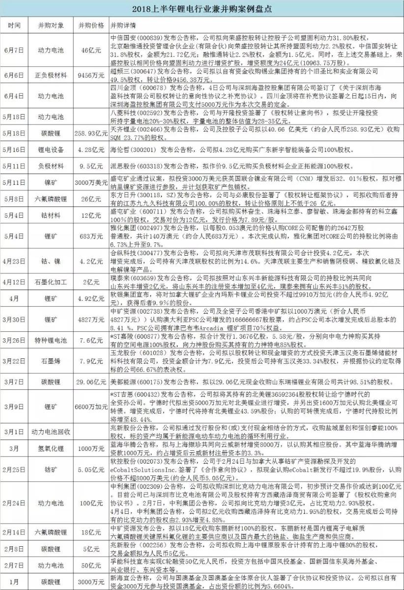 對此,高工鋰電盤點(diǎn)了2018上半年鋰電領(lǐng)域的兼并購案例,且看下圖: