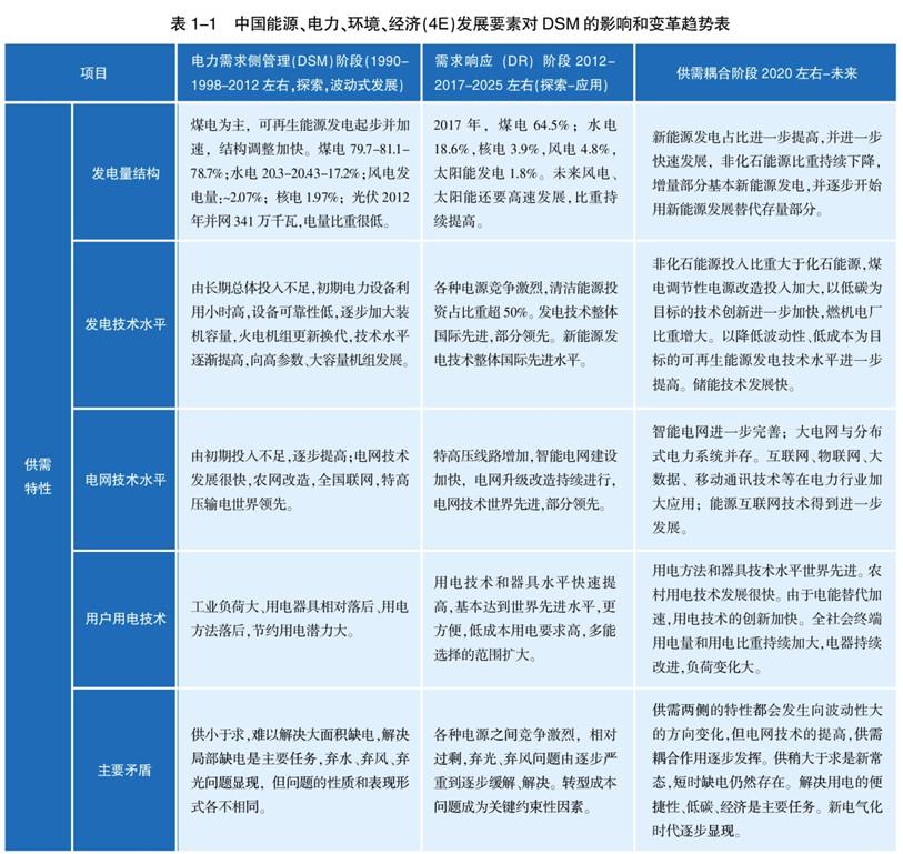 表1-1 是能源、電力、環(huán)境、經(jīng)濟(4E)發(fā)展要素與DSM的影響和變革趨勢表。從表中不難看出,DSM、DR以及供需耦合,都是以解決電力供需問題為導(dǎo)向的,因此,任何管理手段都必須隨著問題的發(fā)展和解決問題的需求與時俱進。DSM每個階段的時間長短并不相同,變革并不因為時間長短而變,而供需特性和低碳(結(jié)構(gòu))特性變化才是關(guān)鍵點,即電力短缺與富余度以及新能源所占的發(fā)電比重大小決定了不同階段到來的時間點。從電力需求管理手段的內(nèi)涵上看,三個階段在時間的連接處和對應(yīng)的措施上是會有重疊的,且后一階段的措施是對前一階段的繼承、完善、發(fā)展而不是割裂。面向未來,一般意義上的電力需求管理將會一直延續(xù)至電力的長遠發(fā)展,但作為傳統(tǒng)或特定意義上的“DSM”的作用將隨著電力供需矛盾轉(zhuǎn)化、能源電力清潔低碳轉(zhuǎn)型發(fā)展、電力技術(shù)和用電技術(shù)的進步等而逐步淡化,并終將成為歷史。
