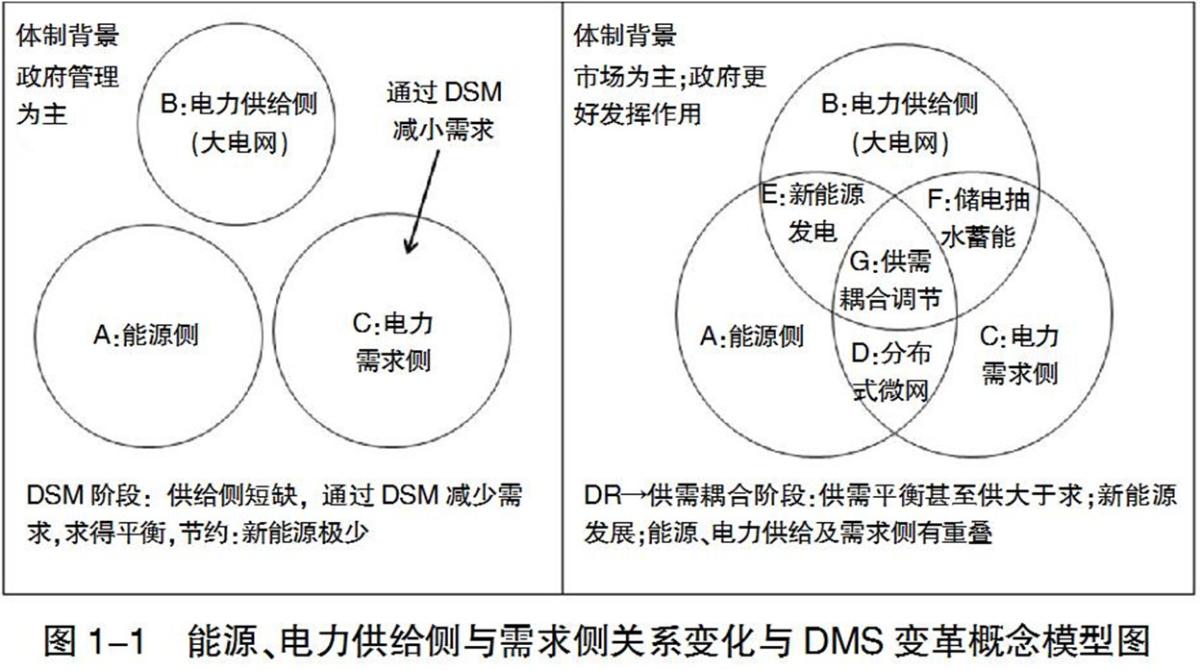 圖1-1是說明能源側(cè)、電力供給側(cè)、電力需求側(cè)的關(guān)系變化與DMS變革的概念模型圖。圖中“A:能源側(cè)”“B:電力供給側(cè)”“C:電力需求側(cè)”等3個圓形圖案。雖然電力的供與需在物理上共同組成一個系統(tǒng),且電能的發(fā)、輸、配、供、用在電網(wǎng)內(nèi)是瞬間平衡的,但各環(huán)節(jié)的概念是清晰的。圓圈圖之外可以看成是體制機制部分,圖的左側(cè)示意DSM階段主要是發(fā)揮政府行政管理的作用,而圖的右側(cè)示意DSM向DR及供需耦合階段的變革主要是發(fā)揮市場機制的作用,但政府也應(yīng)更好發(fā)揮作用。在圖的左側(cè)部分可以看出,DSM第一階段是在供給短缺、政府管理背景下,A、B、C三個不相交的圓(或者相交極少)所代表的方面,各方按上下游關(guān)系和各自規(guī)律運轉(zhuǎn)。在這一階段,DSM主要通過減少電力需求側(cè)的需求(節(jié)約),解決供給側(cè)的缺口或者滿足調(diào)峰需求,達到電網(wǎng)及電力系統(tǒng)安全前提下,技術(shù)層面上的供需平衡。顯然,此階段的DSM顯然不是為了解決能源電力低碳轉(zhuǎn)型問題。在圖的右半部分可以看出,在供需平衡或富余、市場手段為主政府發(fā)揮更好作用背景下, A、B、C三個圓相交了,相交后形成了4個新區(qū),即D:分布式微網(wǎng)區(qū);E:新能源發(fā)電區(qū);F:儲電包括抽水蓄能區(qū);G:供需耦合區(qū)。當然,A、B、C三個圓并不是同時相交的,相交的面積重合度也不同。三圓相交時間和重合度大小,決定了SM向DR方向變革的快慢和程度,這也是各國的DR并不是同一個模式的原因。在圖上雖然沒有顯示出來,但A、C兩個大圓所包括的所有內(nèi)容都是智能電網(wǎng)覆蓋區(qū),圓與圓相重合的部分是智能電網(wǎng)能夠發(fā)揮最大作用的部分;G部分是電力供需耦合發(fā)揮作用的部分。而A、B、C三個大圓則是能源互聯(lián)網(wǎng)覆蓋區(qū),也說明了,能源互聯(lián)網(wǎng)的基礎(chǔ)和核心是智能電網(wǎng)。我們由前述的未來發(fā)展的趨勢可知,3大圓相交的部分會越來越大,所以DR發(fā)揮作用的范圍也越來越大,當3圓相交到很大程度時,電力供需耦合將發(fā)揮主導(dǎo)作用。