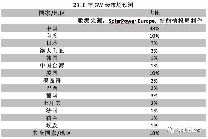 SolarpowerEurope預(yù)計(jì)包括中國、美國、印度和日本在內(nèi)的主流市場仍然是全球光伏市場領(lǐng)導(dǎo)者。歐洲開始復(fù)蘇,法國、荷蘭重回大眾視野;而像埃及和韓國這樣的新興市場會(huì)取得進(jìn)一步發(fā)展。兩個(gè)拉丁美洲國家的市場亦令人矚目,2018年,巴西和墨西哥裝機(jī)量會(huì)超過1GW。