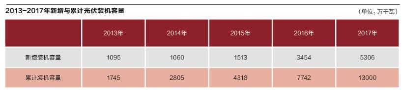 截至2015年底,中國(guó)光伏發(fā)電累計(jì)裝機(jī)容量4318萬(wàn)千瓦,問(wèn)鼎全球光伏發(fā)電裝機(jī)容量最大國(guó)家?;仡?017年,中國(guó)新增光伏并網(wǎng)裝機(jī)容量達(dá)到53.06GW,同比增長(zhǎng)53.6%。累計(jì)光伏裝機(jī)并網(wǎng)量達(dá)到130.25GW,同比增長(zhǎng)68%。新增和累計(jì)裝機(jī)容量均為全球第一。其中,光伏電站累計(jì)裝機(jī)容量100.59GW,分布式累計(jì)裝機(jī)容量29.66GW。