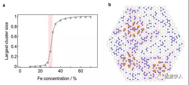 圖7. 由處于鈉層相鄰兩個(gè)過渡金屬氧化物層中的鐵連接鈉位構(gòu)成的網(wǎng)絡(luò)的逾滲(percolation)模擬。a)模擬得出的逾滲閾值大約對(duì)應(yīng)鐵的成為為30%時(shí)。b)對(duì)應(yīng)于鐵的成分為28%的一個(gè)例子。藍(lán)點(diǎn)和灰點(diǎn)是兩個(gè)相鄰層中鐵和非鐵的其他過渡金屬的投影位置。粉紅點(diǎn)是由鐵連接的鈉位點(diǎn),橫跨整個(gè)模擬區(qū)域。橙色點(diǎn)是三個(gè)鈉團(tuán)簇的例子。