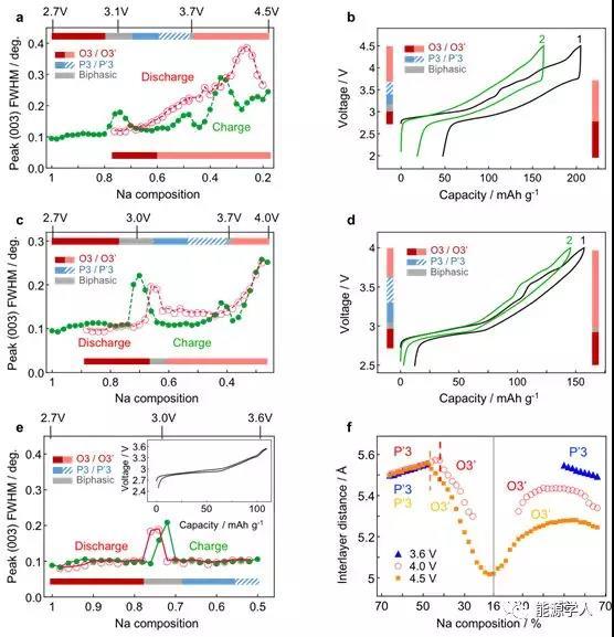 圖4. 不同電壓截止條件下Na[Fe0.5Co0.5]O2 (FC)的結(jié)構(gòu)演化和電壓滯回曲線 (a)FC在2V和4.5V之間循環(huán)的原位XRD (003)峰的半高寬數(shù)據(jù)和充電(頂部)和放電(底部)的關(guān)于鈉含量的相圖。(b) 相應(yīng)的截止電壓為4.5V的電池循環(huán)測試的第一和第二次循環(huán)的電壓曲線以及充電(左)和放電(右)的關(guān)于電壓的相圖。(c, d) 循環(huán)電壓范圍為2V到4.0V。其余同(a, b)。 (e) 循環(huán)電壓范圍為2V到3.6V。相演化對(duì)于充電和放電相同。插圖:高度對(duì)稱的第一個(gè)循環(huán)的電壓曲線。(f) (a), (c) 和 (e) 中每個(gè)原位XRD測量中層間距離的演變。原位XRD測試和電池測試的速率分別為C / 50和C / 10。注意這里P'3代表具有單斜變形的P3相,而O3'代表另一個(gè)O3相高壓,具有加寬的(003)XRD峰。