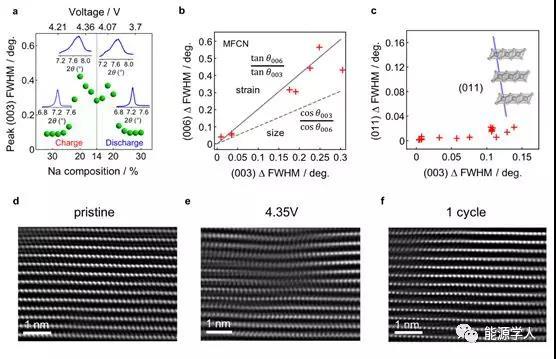 圖2. 通過原位XRD和球差校正的STEM觀察到褶皺相的相關(guān)現(xiàn)象。 (a) 原位XRD測量得到的 (003) 衍射峰的半高寬。以C / 50速率充電至4.5V的過程在約43小時(shí)結(jié)束,相應(yīng)的剩余鈉離子的標(biāo)稱值為14%。插圖從左到右是充電過程中在鈉含量為28%和18%時(shí)以及放電時(shí)相應(yīng)位置的(003)峰的實(shí)際XRD曲線。在圖上方邊緣標(biāo)出了對(duì)應(yīng)電壓值。 (b) 實(shí)測得到的 (003) 和 (006) XRD峰半高寬的角度依賴性與應(yīng)變展寬(實(shí)線)和尺寸展寬(虛線)相比較。每個(gè)紅色標(biāo)記對(duì)應(yīng)于原位XRD掃描結(jié)果,與應(yīng)變展寬模型十分接近。 (c) (011) 與 (003) 平面對(duì)應(yīng)的的XRD展寬對(duì)比。插圖中的模型指明了 (011) 平面的方向。說明在金屬氧化物面內(nèi)沒有明顯的應(yīng)變分量。 (d-f) 為MFCN在b方向的HAADF-STEM圖像。所使用的分別為樣品是 (d) 原始薄膜,(e) 以C / 10速率充電至4.35V和 (f) 在C / 10速率下2V至4.5V之間的一個(gè)循環(huán)之后。亮斑點(diǎn)表示過渡金屬離子的位置。